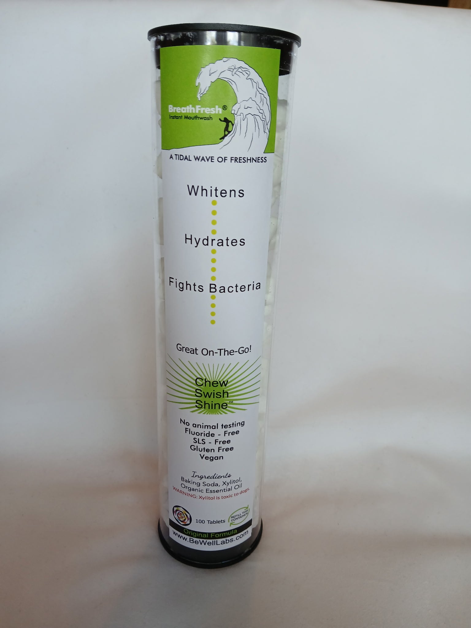 The chewable On-The-Go product for Whitening, pH balancing, Freshness, and Rehydration of the mouth. Refill your favorite air-tight container. Made with the fewest ingredients.